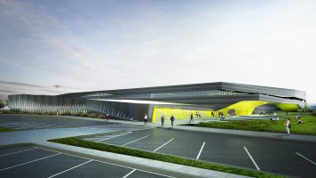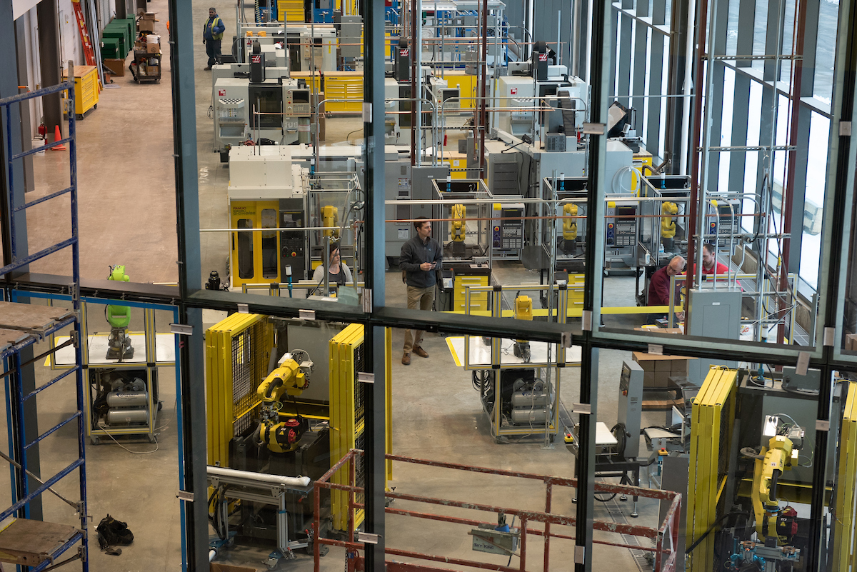 A complete remodel and repurposing project. This project takes an existing parking structure and creates a collaborative work space and pathway for students through campus. The buildings design allows onlookers to have a clear view into the manufacturing technology and exhibits the sophistication of the manufacturing practices of today.