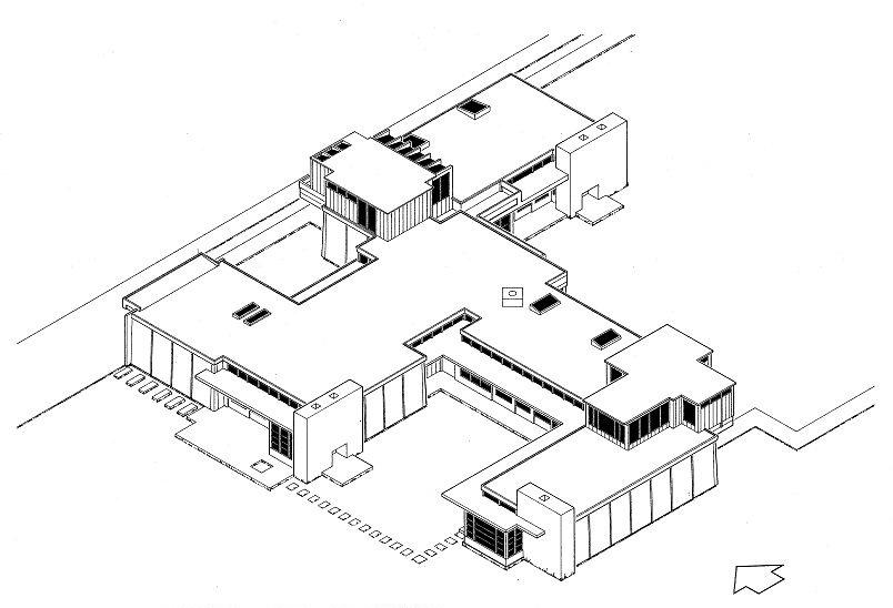 Birthplace of Californian modernism; integrates both indoor and outdoor spaces to suit the Californian climate with two L-shaped areas separated into four studio spaces, two semi-sheltered rooftop sleeping spaces, a communal kitchen with clerestory windows, and two grass patios (one for each family) with sunken gardens that are visible and accessible from the interior through redwood sliding door panels
