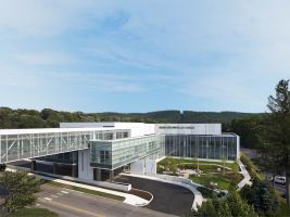 AE Interest: focus on nature, glass facade, rectilinear in shape, skywalk footbridge made of steel trusses connects the center to the main hospital, healing garden extends into indoors into the lobby.