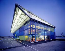 AE Interest: design inspired by combining seagoing elements – the container and the sail: walls are comprised of stacked multicolored freight containers, a dynamically shaped sail-like roof.