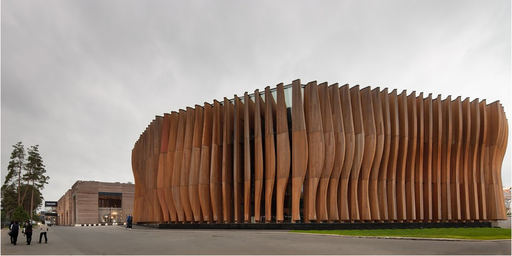 AE interests: A deep facade of wave-shaped wooden blades gives the building dynamics and a stable structure; multifunctional transfor mer hall provided by eight hydraulic mechanisms to lower or raise the floor platforms.