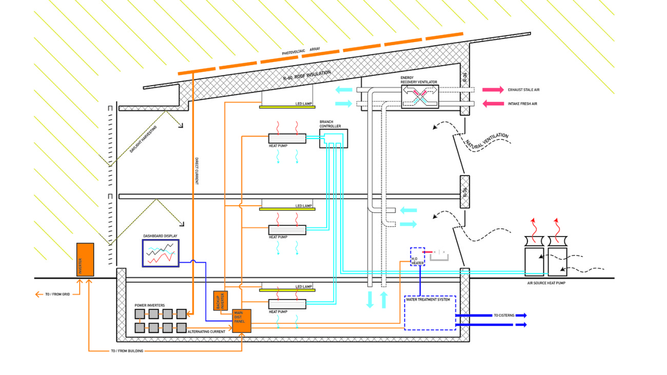AE Interest: One of 28 “living buildings” in the world. 900+ PV panels collect over 100% of building energy usage. Rainwater capture and purification system that provides for building’s water usage. Mass timber structure. Rooftop honeybee apiary and blueberry orchard.