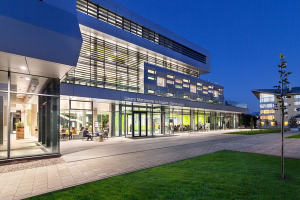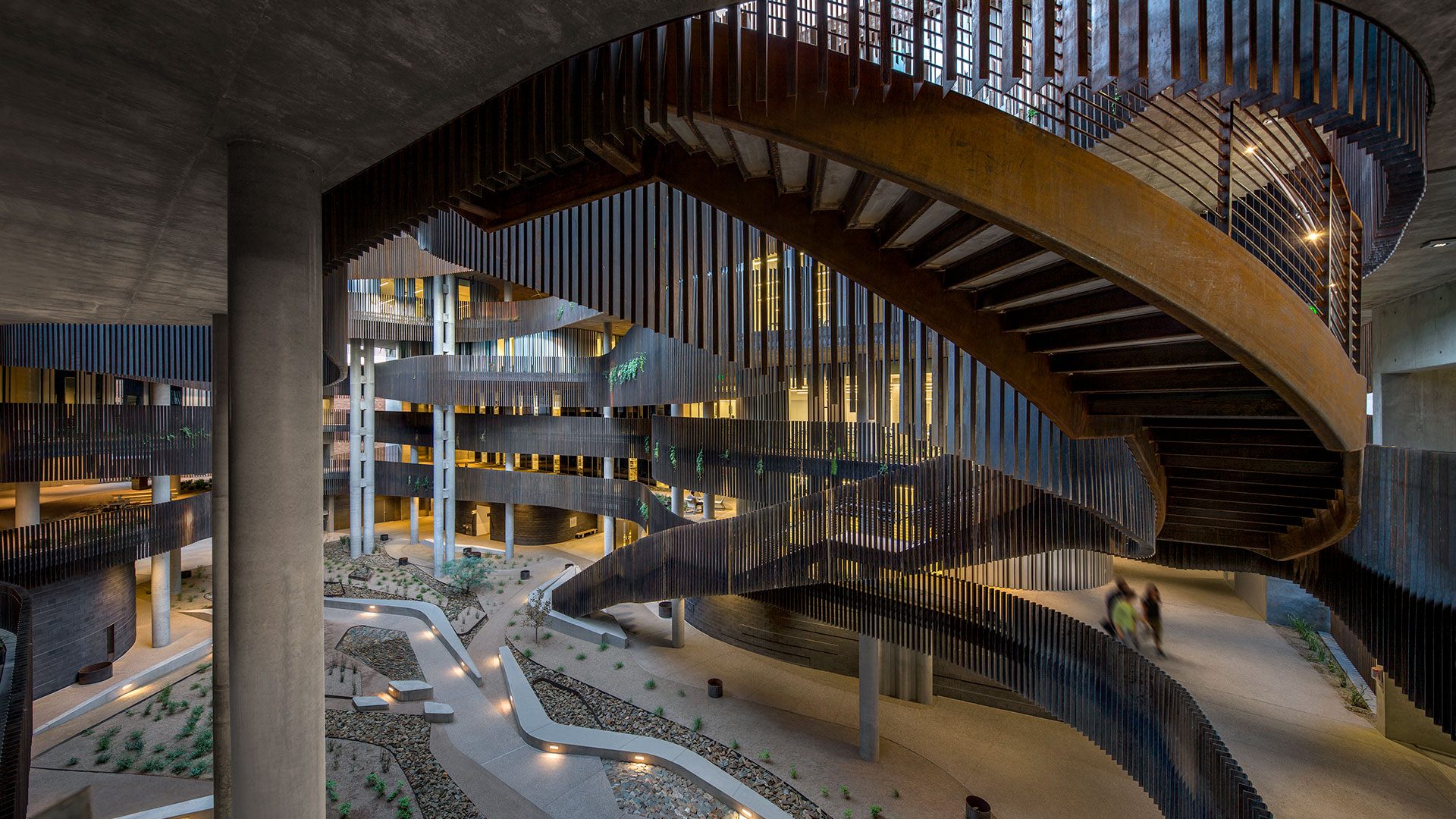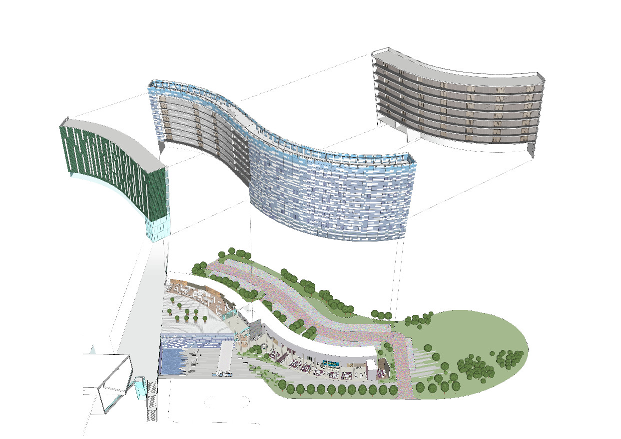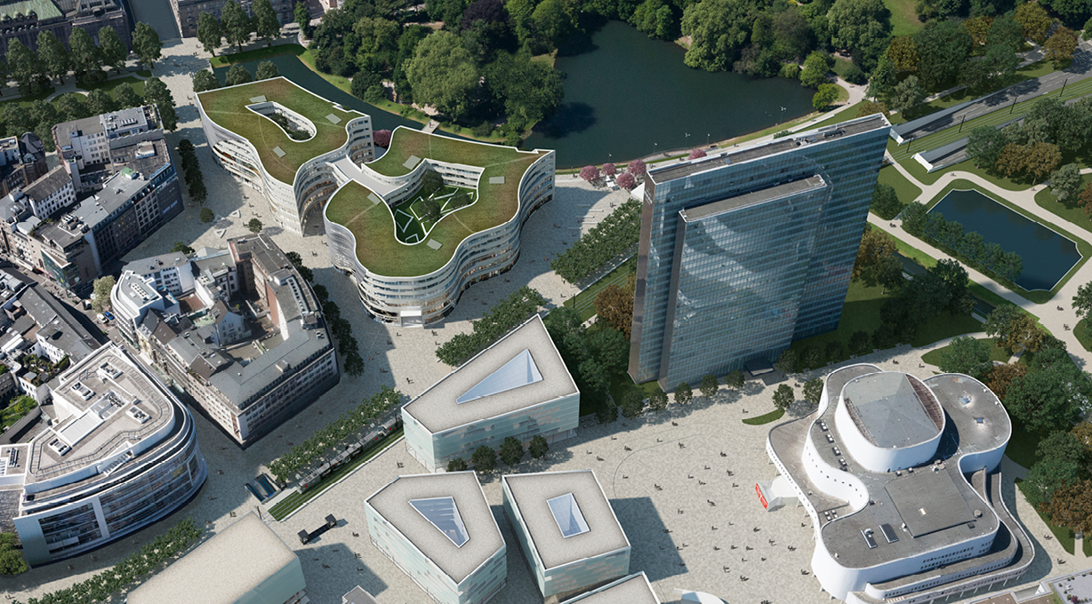 432,300 square feet of buildings and retail space; Unifying point for the city; Green roof system and landscape incorporated throughout [a1]; Mix of straight and curved geometry; Urban regeneration; LEED platinum award for sustainable construction [a2]