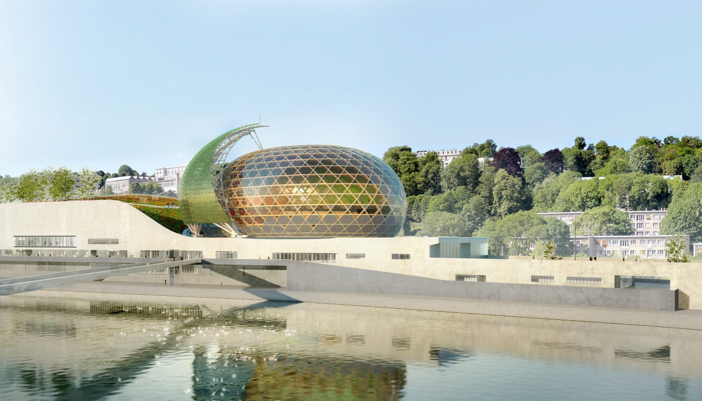 Extremely adaptable space for the arts and collaboration, outer shell can be moved along railway and doubles as a crane for adding to art exhibits, steel diagrid with ethylene tetrafluoroethylene (ETFE) to make it lightweight, strong, and insulating, LEEDSilver status
