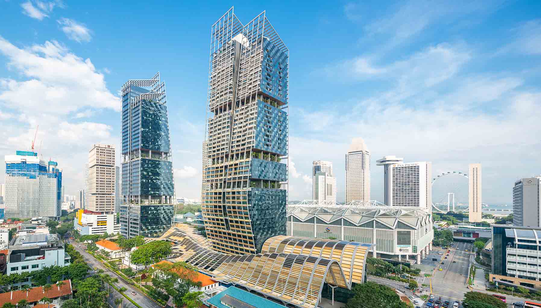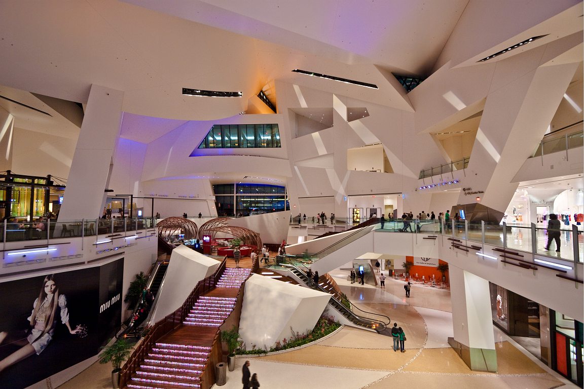 500,000 sq.ft of jagged shapes and dramatic spaces for luxury retail; LEED certified sustainability with radiant floor cooling, efficient water fixtures, and skylights [a1].