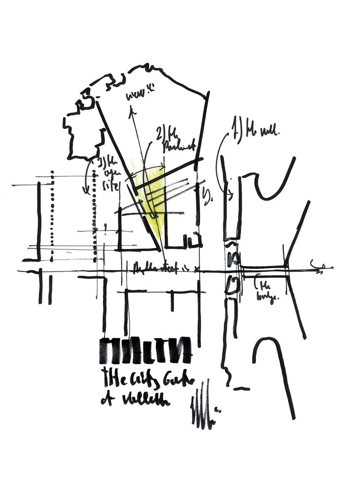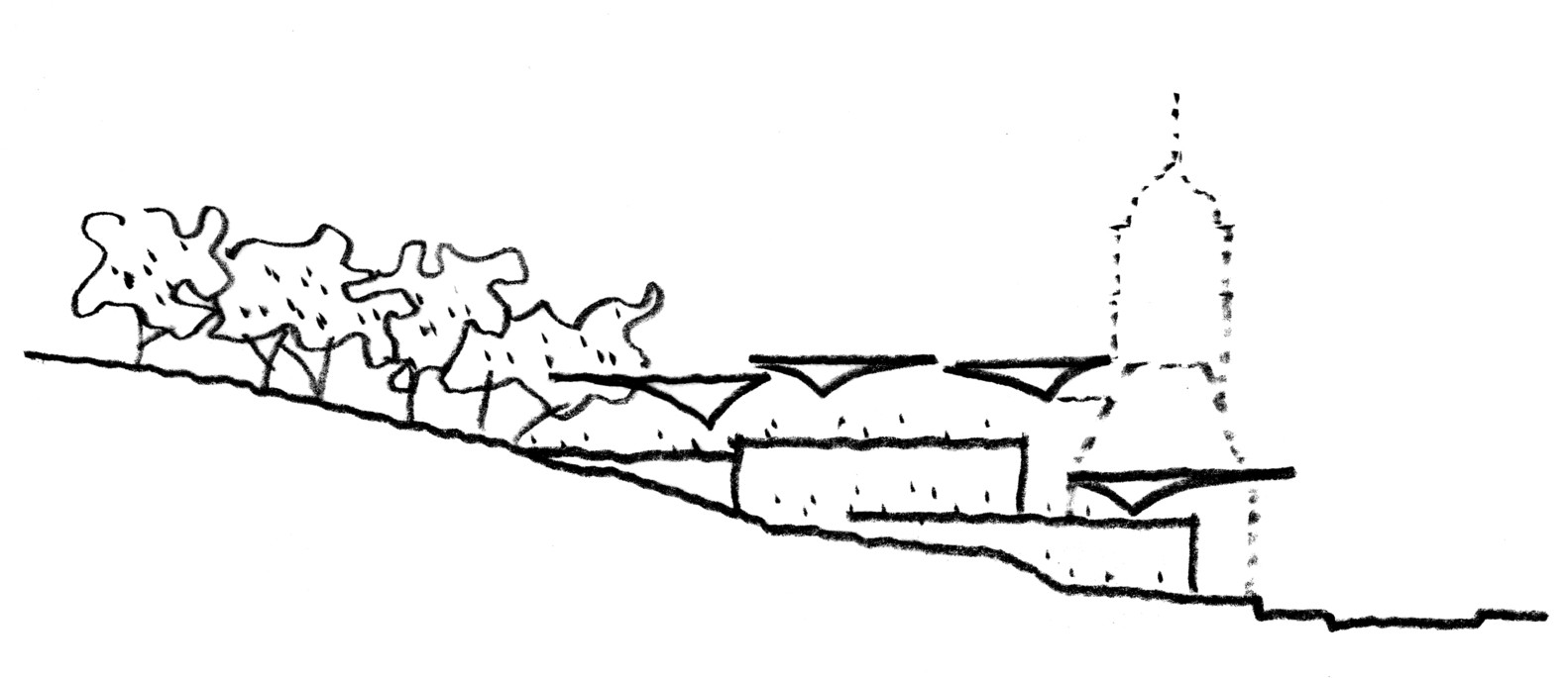 Mirrored elevated walls offers an unobtrusive shelter from busy city life; entrances laid out to connect to nature on human scale; Competition winning design for art exhibition[a1]
