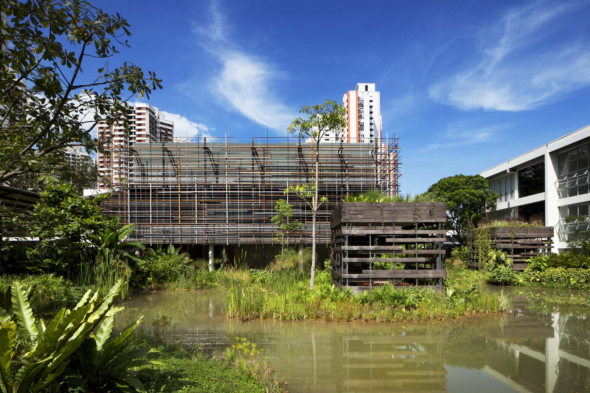 The sustainable tiles have air purification properties and are self-cleaning; Influence of Chinese culture – dragons (associated with farming), the shi-tang style dining halls and the landscape, a fundamental element of life; Inside there is a bamboo matrix that incorporates 200 screens in an exhibition [a1].