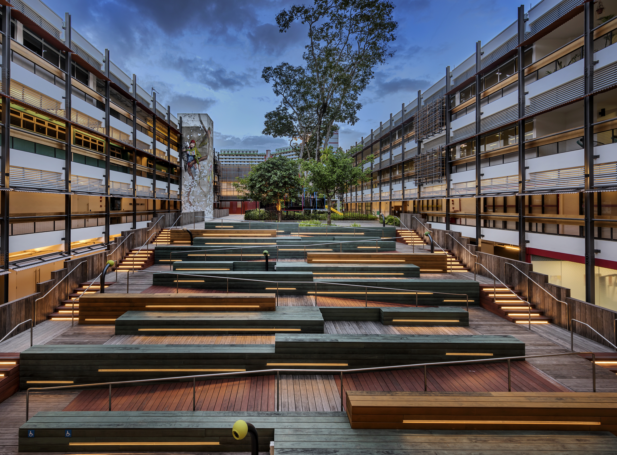 11 polyester hanging globes optimize air flow and natural lighting, cutting energy consumption by 40%. The curved wooden lattice roof was made by bending individual timber pieces on site.