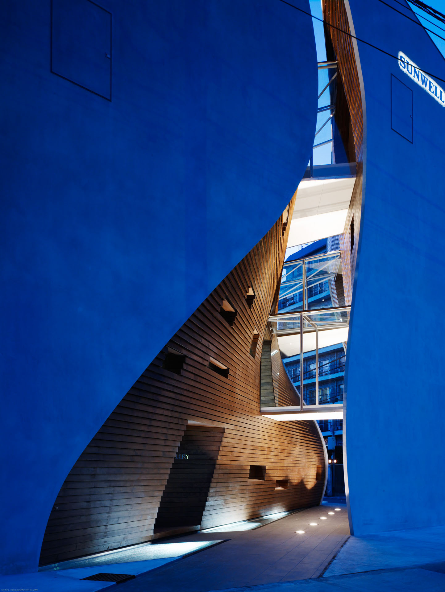 Concrete block with organic wood cut outs, curved walls connect spaces, deliberate movement of people through the space, glass bridge