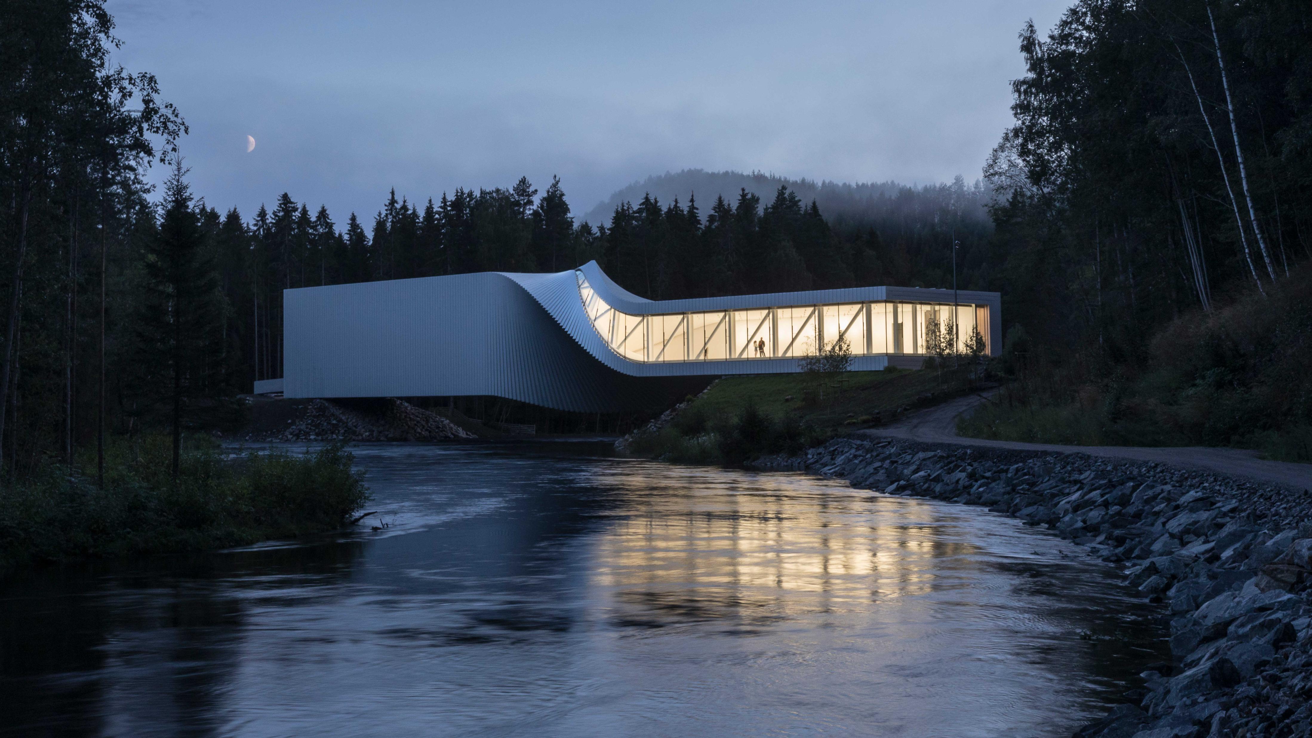 Exhibition center and bridge between two sections of sculpture gardens, stacked aluminum panels create the twist of the structure, 3 unique spaces inside made to partner with landscape