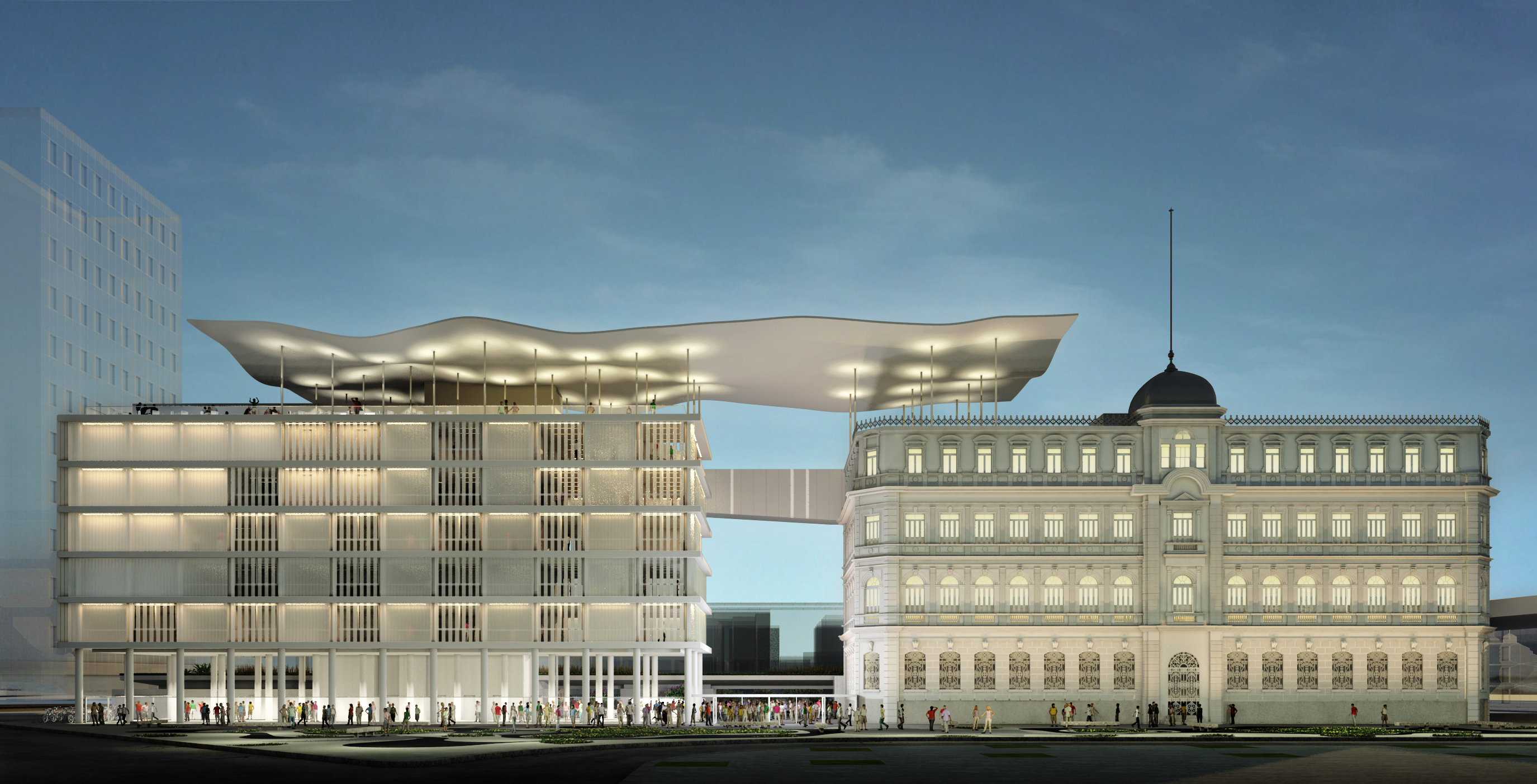 AE Interests: undulated concrete canopy, suspended catwalk connecting the two buildings, translucent glass facade, pilotis, public square for displaying sculptures between two buildings