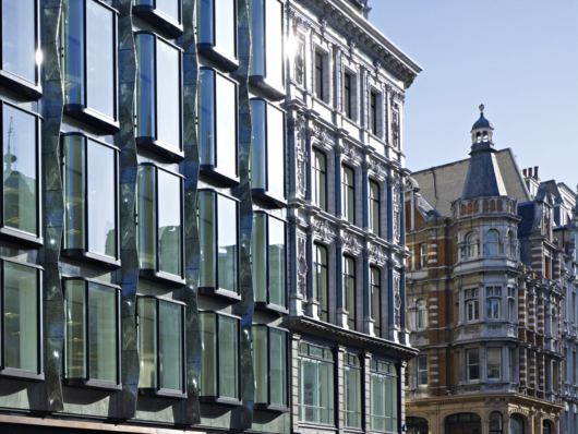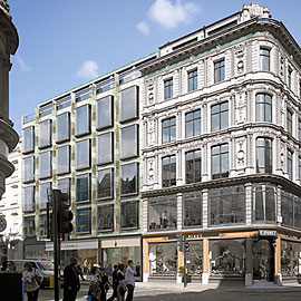 AE Interest: Project Oriel windows and faience facade. Merges a new high retail shopping building with a Grade II listed Edwardian building to revitalize a neighborhood.