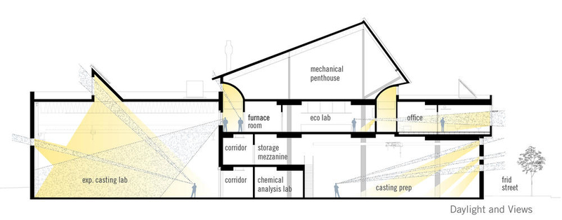 Certified LEED platinum in 2013; Achieved sustainable site design, indigenous plants and rainwater reuse; Clerestories bring natural light into corridors and labs; Customized orientation specific solar shading reduces glare and thermal gains; 100% fresh air ventilation [a]; Thermal collection system located on roof; 77% reduction from national median Energy Use Intensity (EUI) for building type; Just under one-third of the construction material is made from recycled materials, 44% of the construction material was harvested and manufactured within 450 miles of the site[b]; Exterior materials (zinc and glass fiber cement panels) are rated for long-term performance and interior materials are tough and robust for a long term durable building plan