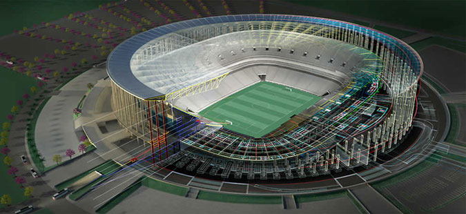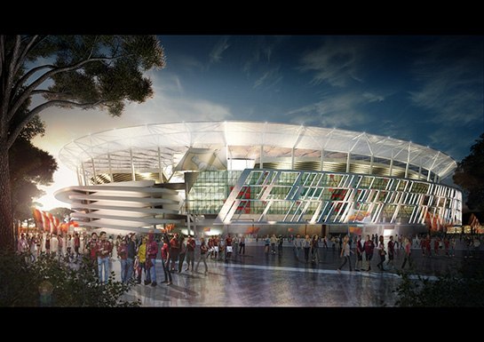 AE interest: Contemporary and dynamic, Colosseum inspired design, complex concrete and steel seating arena, sustainable sports venue, carbon neutral footprint.
