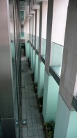 AE Interests: The building is a giant inverted capital letter ‘L’, cantilevered overhang held up by diagonal columns, concrete frame for natural cooling, “tongue” on the roof acts as a shade for ventilation shafts, the north face is covered in multi-colored glass panels and the rest of the exterior is made of copper.