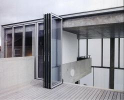 AE Interests: Walls, floors, and ceilings are made of concrete cast in situ; reinforced concrete frame, galvanized-steel panels are hinged for ventilation, black Alwitra roofing membrane, south facing exterior double-glazed panel can slid across to open up one wall of the living room.