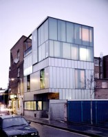 AE Interests: Angular shaped building was determined by positioning around the old pine trees, all floors accessible by ramps and not stairs, ventilation slots are cut into a trapezoidal ramp that conceals the HVAC system, steel-clad facade.