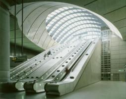 AE Interests: Glass canopies cover station entrances; fair-faced concrete, stainless steel, and glass were the only materials used in the stations construction; concrete diaphragm tunnel walls are left exposed.