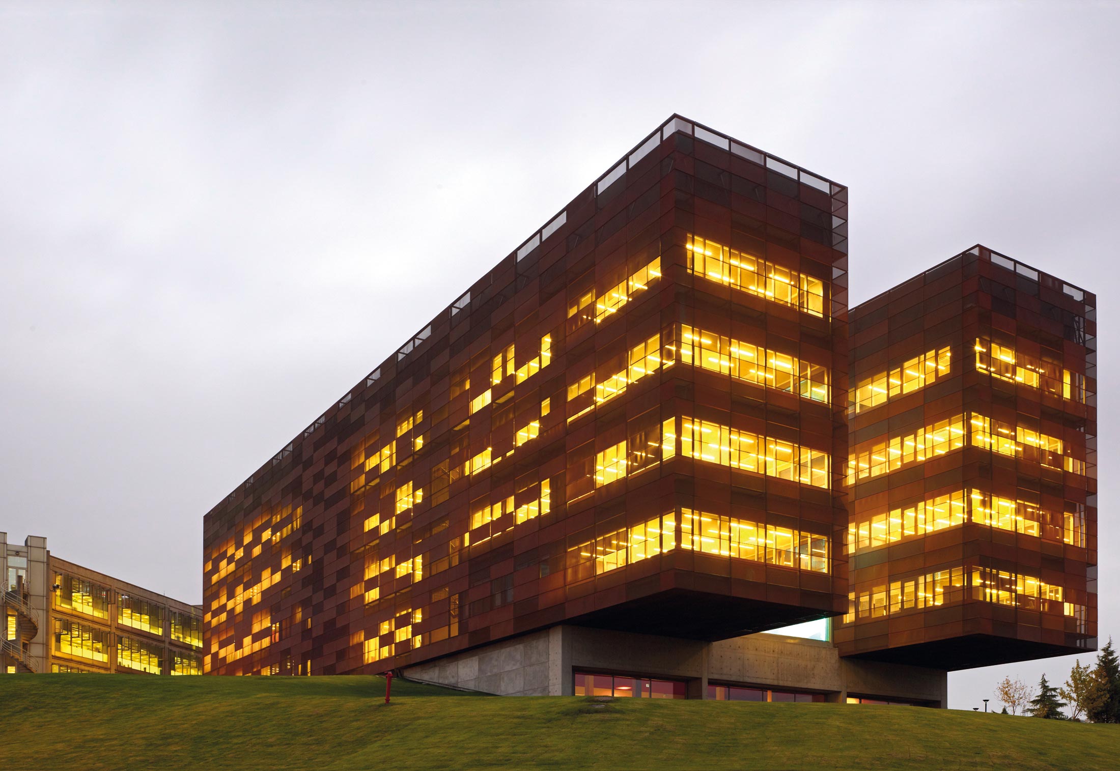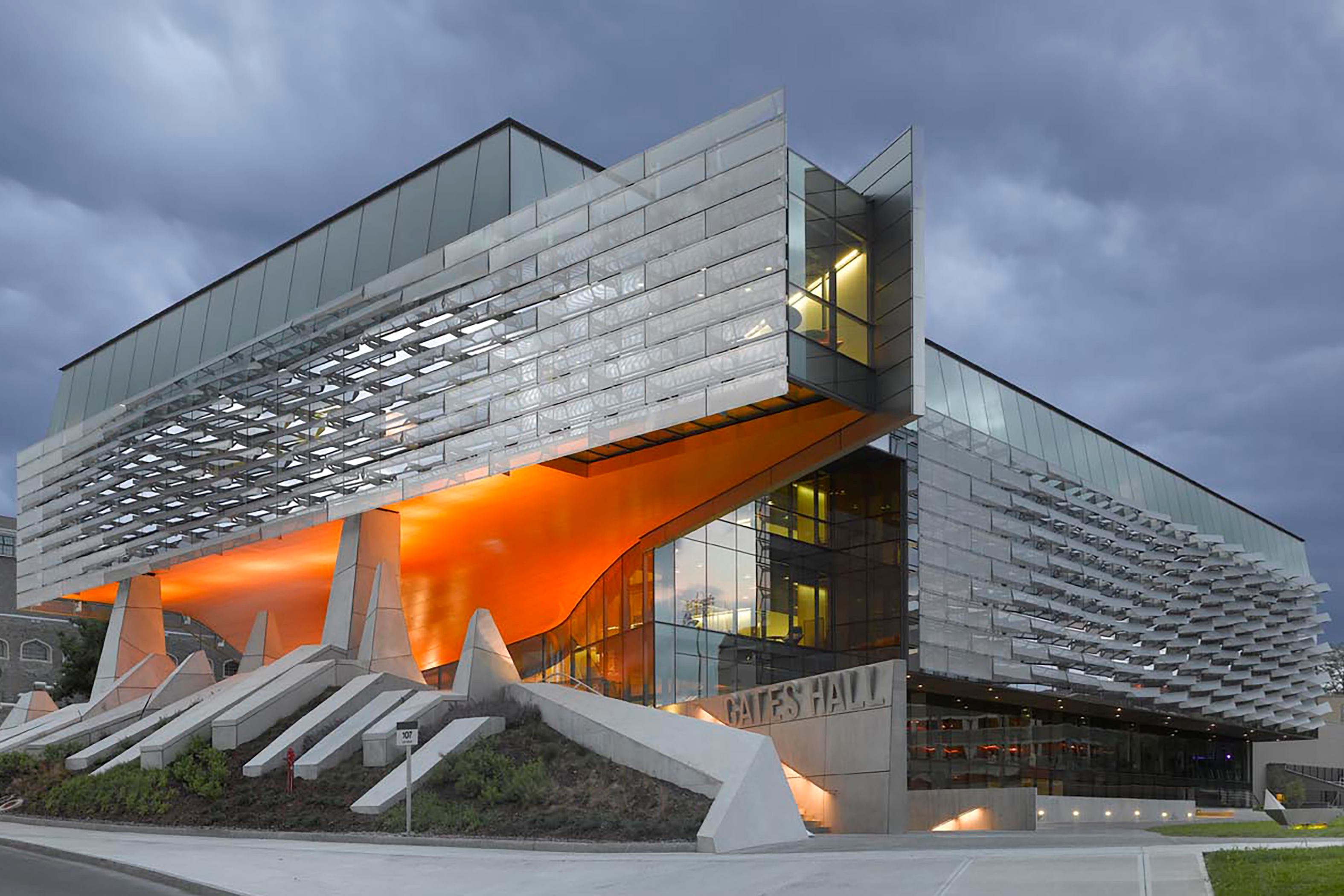 Brings together Cornell University’s Computing Science and Information science departments; recycled and renewable building materials are used throughout the building [a]; Advanced digital modeling tools used in designing the pattern, geometry, and details of the skin speak to the profound impact of computing on the arts and sciences [b]