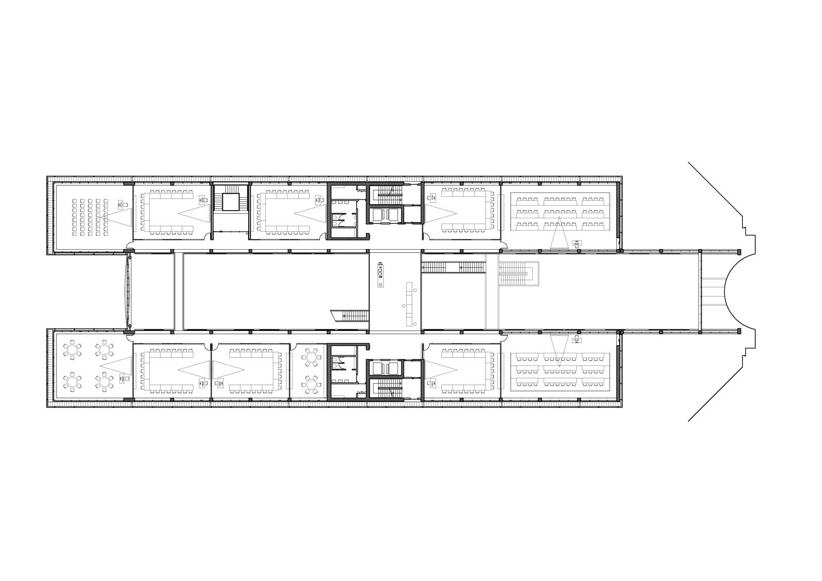 The Yapi Kredi Academy building is an existing; “the two program beams, stemming from the complex, stretches out on the plane of a missing cube, cannot be stopped and cantilevers as topography drops. They are covered by stretched copper panels as the outer layer of the facade, stripping it off from any hint of scale. Due to the stretching process, each panel has a doublefold direction from left to right” [a]