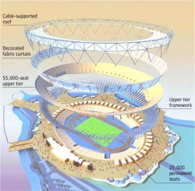 AE Interests: Designed to hold 80,000 spectators during the Olympics then partially disassemble to create a permanent 25,000 seat stadium, translucent fabric wrap around exterior of building allows it to breathe naturally, complex steel framework, sustainable design.