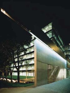 AE Interests: Aga Khan Award for Architecture; this building started Jean Nouvel’s acclaim. A matrix of photosensitive, mechanical apertures open and close throughout the day to control the light level inside the building. Steel structure, custom exposed elevators. Shading, daylighting, cultural expression.