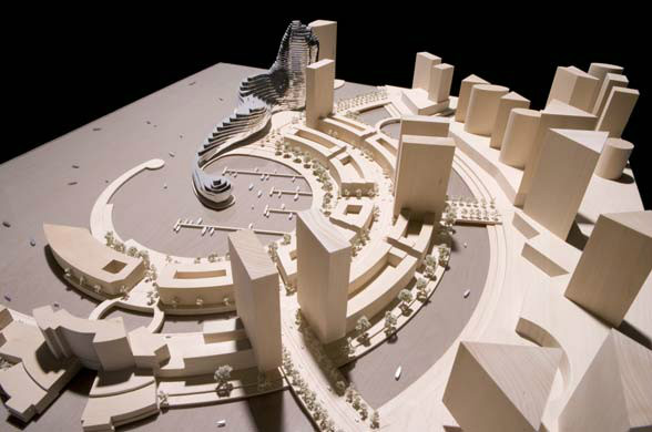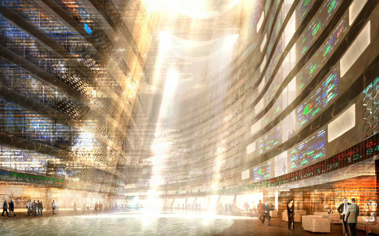 AE Interests: Environmental computer analysis, sinuous dynamic plan, reactive louvered shading system angled to minimize solar gain depending on orientation, soaring central atrium, form rooted in a sustainable environmental strategy that relies on a series of passive controls.