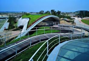 AE Interest: Grin Grin Park lies on an artificial island and moves the architecture through the site. The design of the landscape melds together building and site with materials that compliment the hilly artificial island such as sloping wooden ramps and large glass walls.