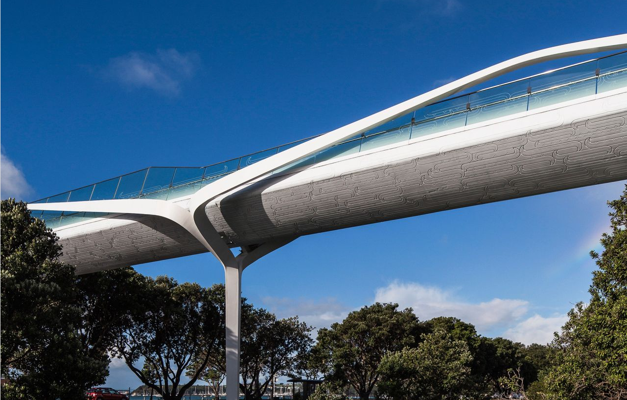 AE Interest: First ever use of helix structure in bridge design, inspired by DNA structure, uses 5 times less steel than traditional box girder bridge design, glass and perforated steel canopy