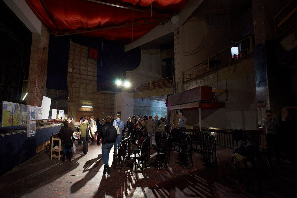 AEInterest: glass plate facade; mixture of waxed concrete, aluminium, glass and wood; 7,000 angled silk screened glass tiles;