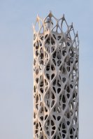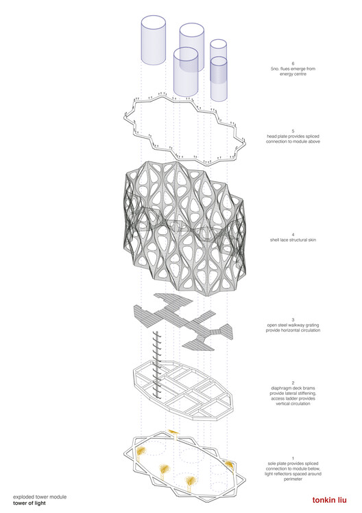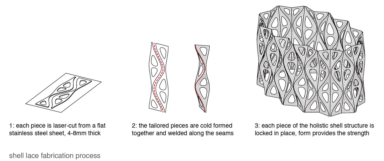 biomimicry, 37m tall sculptural chimney, minimal material usage, light and thin single surface structure, largest built shell lace structure inspired by mollusk shells formation, Manchestor’s historic district, energy landmark, improves energy efficiency by 45%, saves 1,600 tonnes of carbon emissions each year, tailored laser-cut stainless steel sheets welded together, 6-8 mm thick base that tapers to 4mm thick at the top, geometry optimized facade