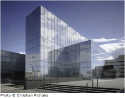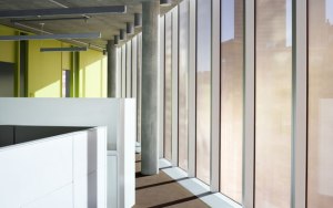 AE Interests: Glass facade with integrated copper mesh, green roof