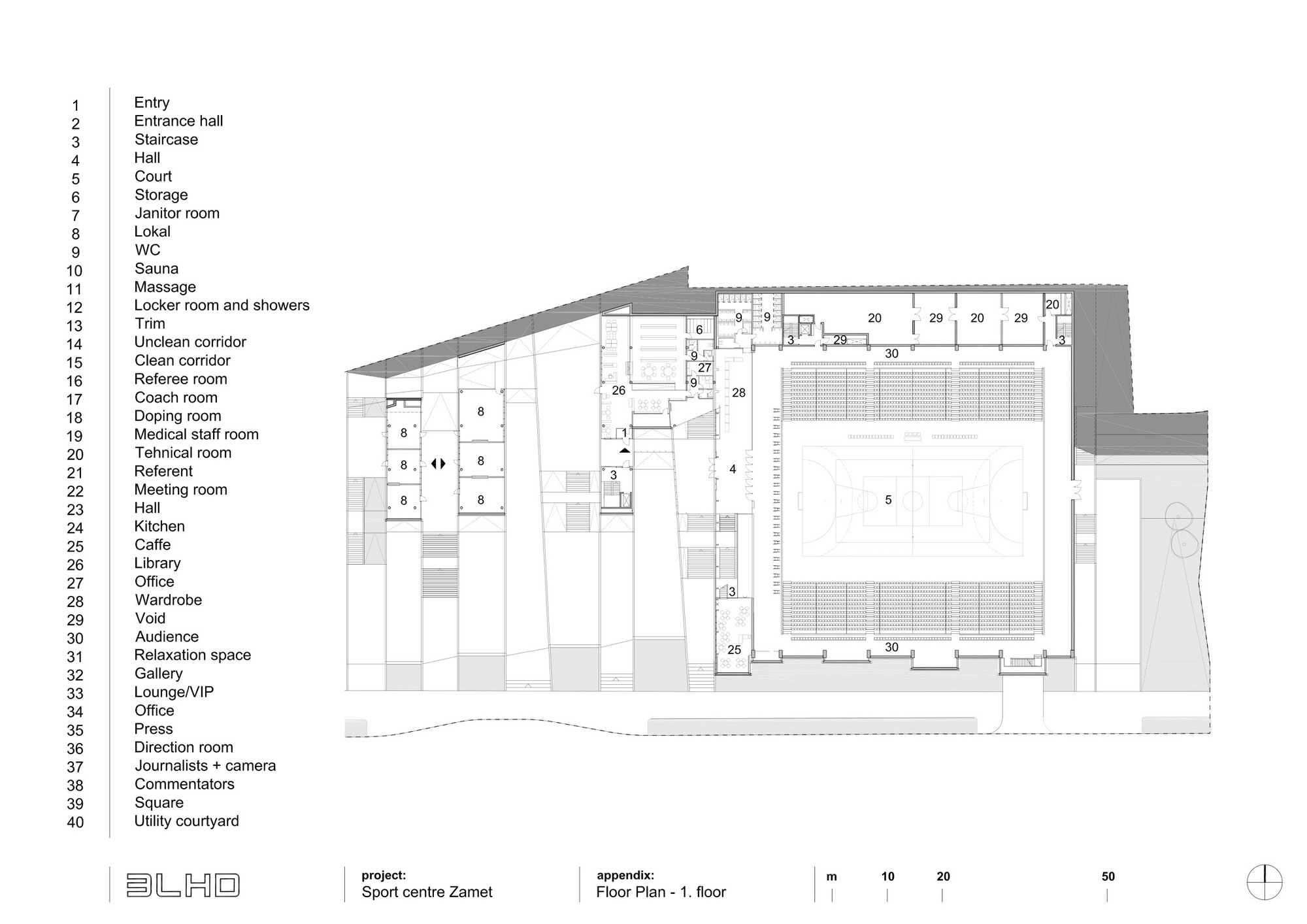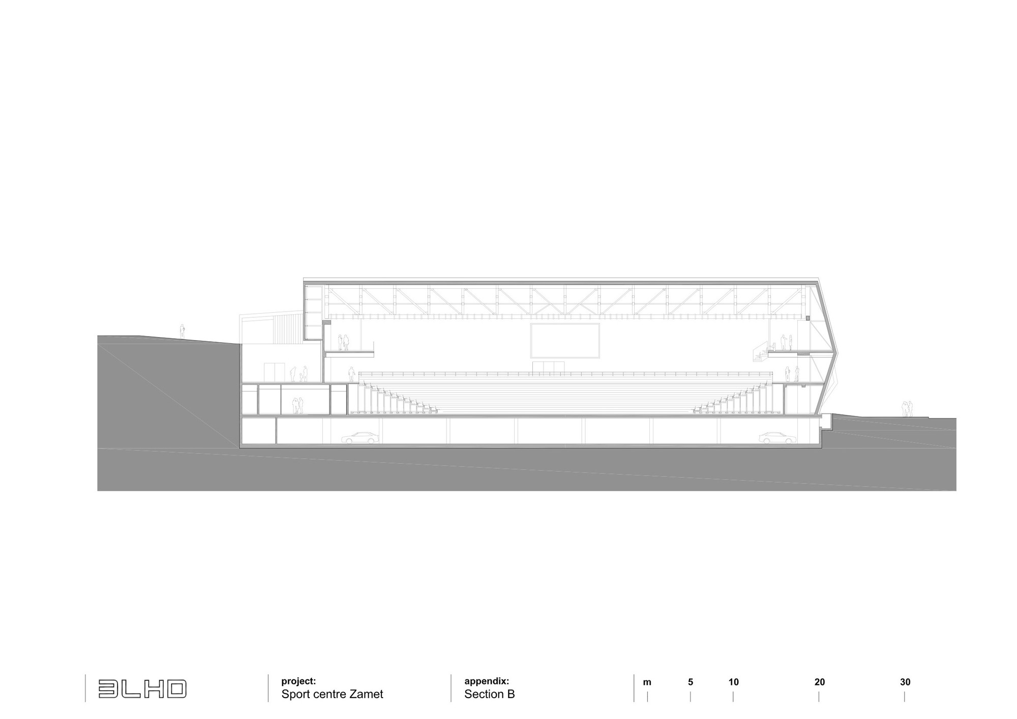unique ribbon style structure integrates building into the terrain, includes library, caffe, “Lokal”, and shopping centre, underground garage, auditorium has adaptable seating that can allow up to 2380 spectators for some sports [a] ArchDaily winner of Building Of The Year in sports category [b]
