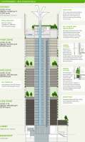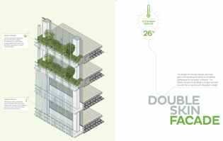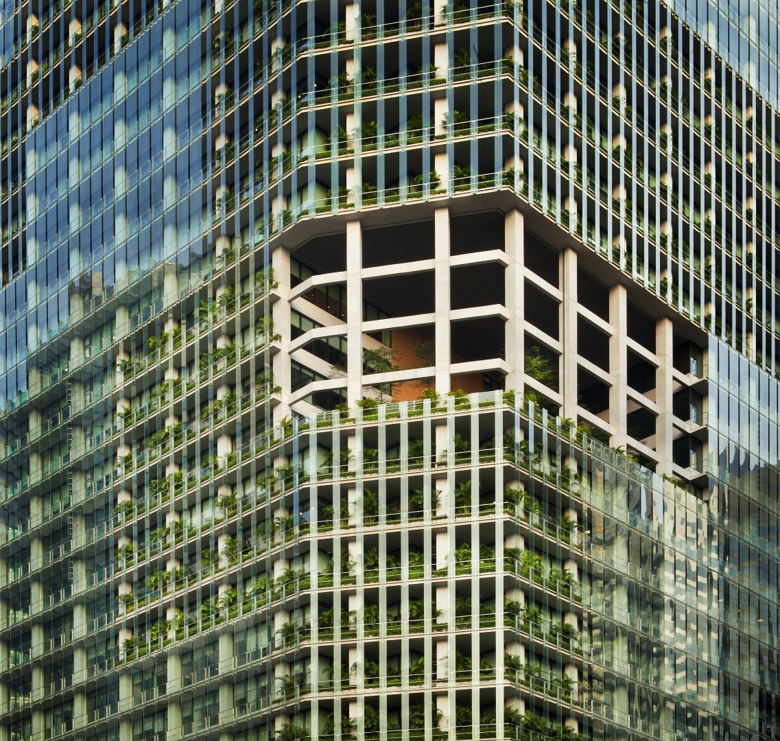 AE Interests: A double skin façade with floor-to-ceiling glazing helps to reduce solar heat gain by 26%, 55% of the façade is covered with living plants, rainwater harvesting is used to irrigate the plants, has sky terraces, uses novel, high-strength concrete to support the structure and reduce the overall quantity of material needed, the flora-inspired structure on the top of the CapitaGreen draws in fresh, cool air which will be distributed to the lower floors