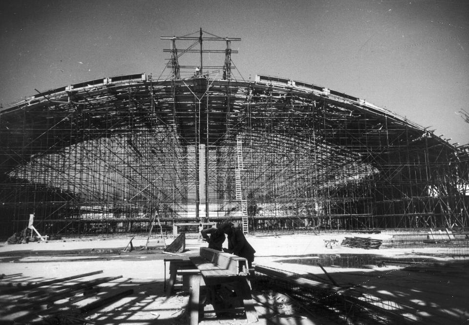 AE Interest: barrel shell and reinforced concrete structure, average thickness of concrete is less than 8 cm, prefab ferrocement made construction quicker, dome features rhomboidal precast concrete pieces, still used today, converted to ice hockey rink for 2006 Winter Olympics.