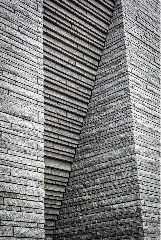 AE Interest: Challenge: needed a large building that wouldn’t overwhelm the site, slit-face gray granite exterior hand-set, clerestory to let light in, green roof and subterranean rooms with skylights create hybrid structure combining building and landscape, use of bronze and marble, set windows with glazing tape.