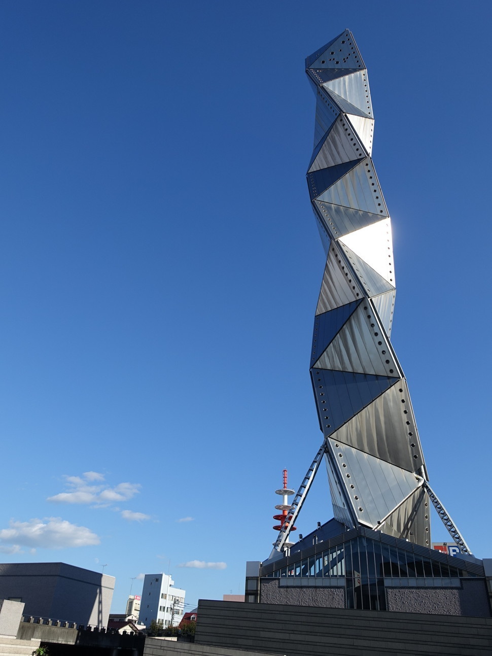 AE Interests: Built for 100th year anniversary of Mito becoming a city. 100 meter tower is composed of spiraling titanium panel units, forming 28 tetrahedrons and 57 isosceles triangles. Titanium was chosen because it is highly resistance to corrosion and weathering. Built to last. First titanium skyscraper in japan!