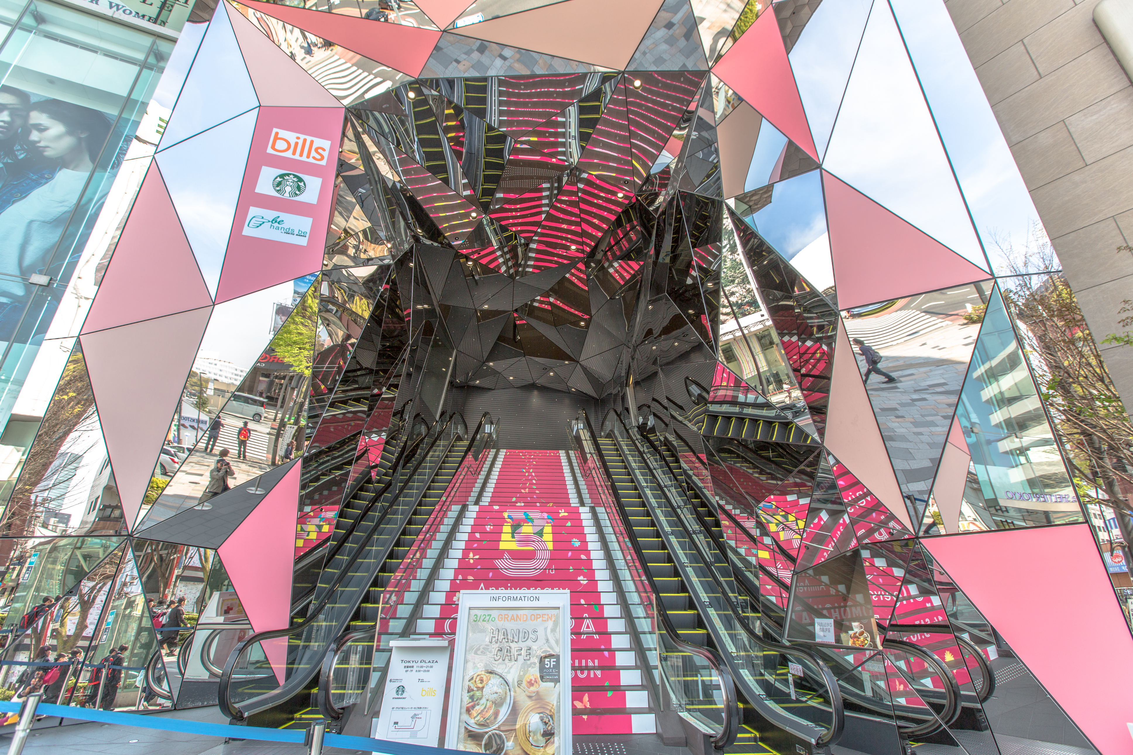 AE Interests: The idea of the space was to maximize the value of space for it cannot be replicated through online shopping. A Kaleidoscope-like Entrace tube makes the ride up through the escalators an unforgettable experience. Polygonal panels, as well as contributing to form, absorb seismic movement in desperate measures.