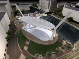 AE Interests: The 17,000 square foot cable stayed canopy covers an ice rink in winter and a 3,500 seat amphitheater in summer. The iconic structure is supported on 2 freestanding steel towers.