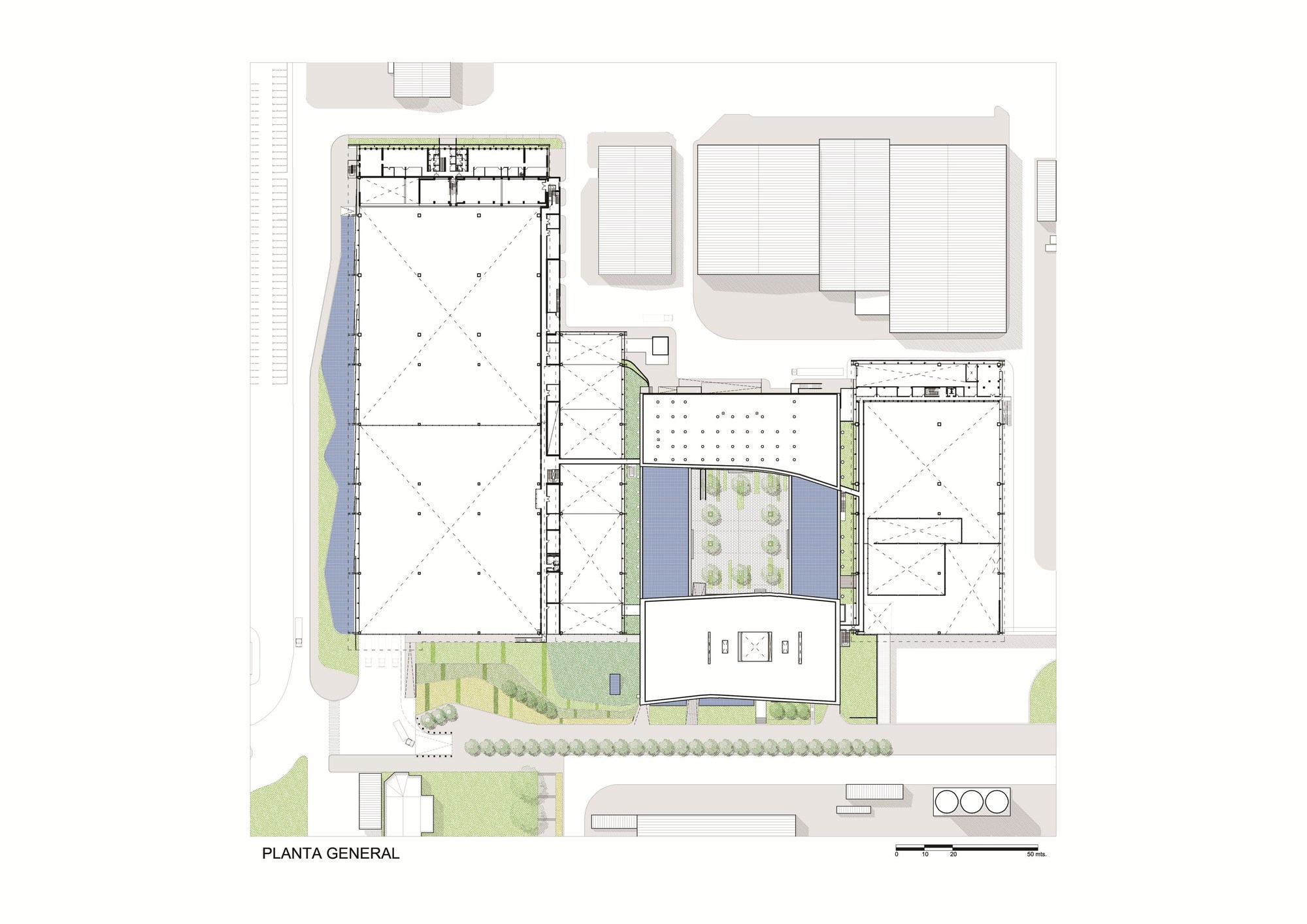Undulating roofs mimic Andes mountains, “passive ventilation, water recovery, natural illumination, rational use of the hydric resources”, “double skins, ventilated façades”, public space between factories, interprets the geographic environment [a]