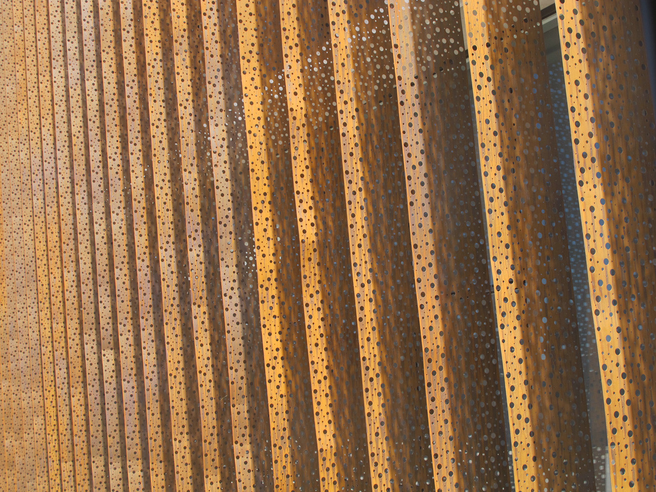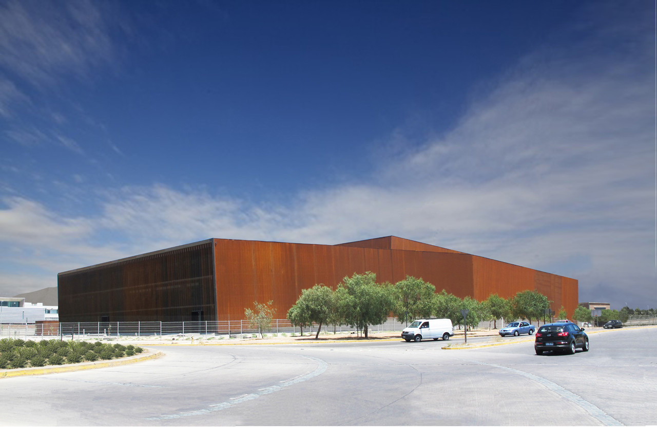 Corten steel double skin that “protects the inside from the exterior temperature and direct solar radiation”, wall as thermal barrier, “vertical Venturi effect of passive ventilation”, geothermic weather conditioning, translucent veils, insulated panel interior, displays shades of orange and brown throughout the day [a]