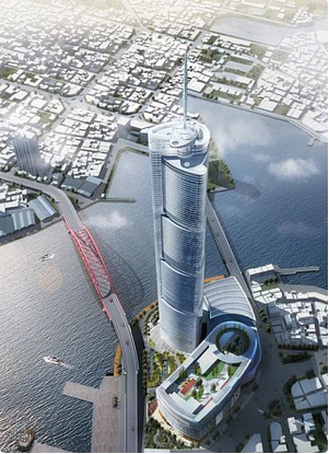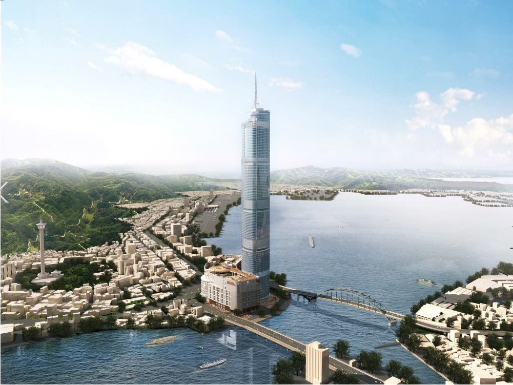AE Interest: located on a peninsula between two bridges; use of a “Y” shaped buttress minimizes material usage and maximizes load resistance allowing different column layouts in all 4 tiers; 24 hour pedestrian walkway around base; will house retail, offices, residential, hotel and a rooftop observation deck