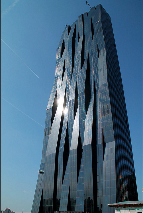 AE Interest: elevated slab of the Donau-City is continued; large terrace provides direct access to the Neue Donau river; two towers are treated as two halves of a block; folds in the facade appear malleable making the building look liquid in some lights