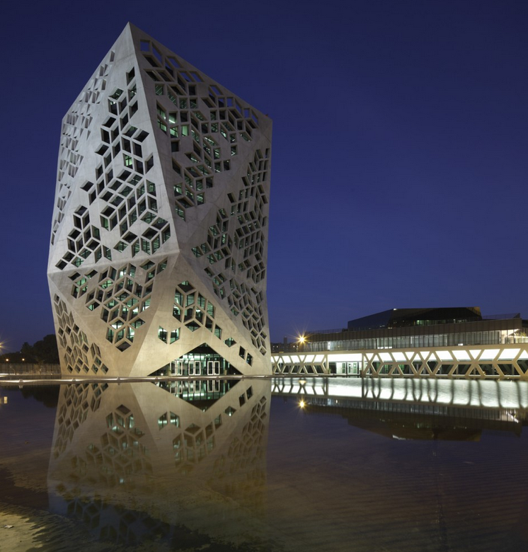 AE Interests: Rectilinear building covered by angular concrete shading skin, reflecting pool.