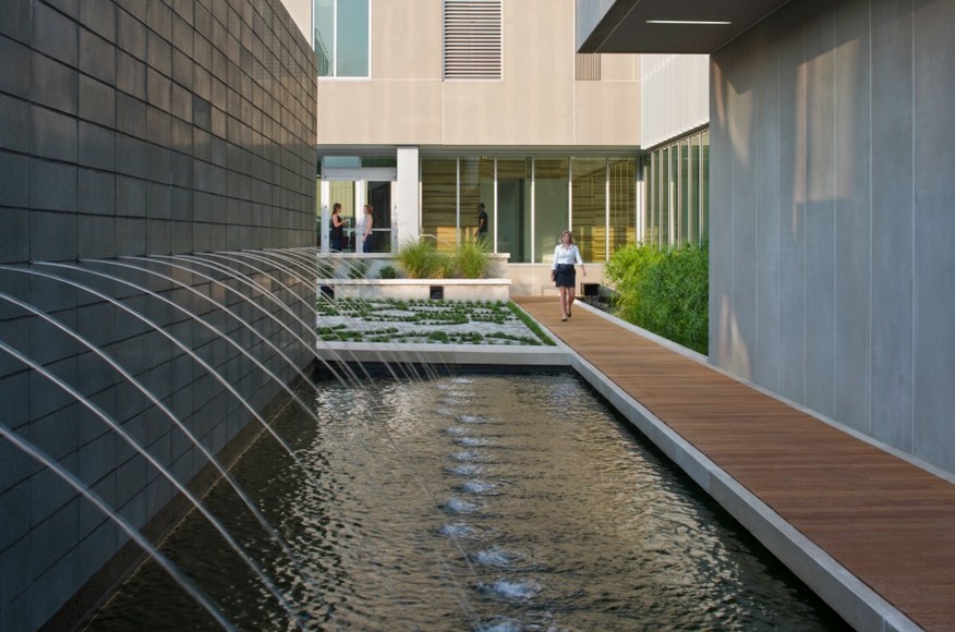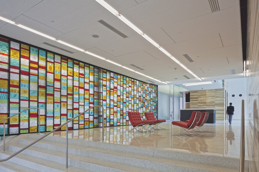 AE Interests: Lab and office facility that obtained LEED Gold certification and uses 1/3 of the energy used in a typical laboratory facility, annual energy costs lowered by $150,000-200,000 [a], pervious concrete in the parking lot to collect drainage from the roof and condensate from AHUs (rainwater storage system) [a], aluminum brise-soleil to allow transparency while still blocking summer solar gains (reflecting traditional use of shutters and screens in New Orleans) [a,b], double-glazed glass in conference rooms with direct access to courtyard to create civic presence and green spaces within NOBIC [b], incorporation of local artists by including recycled glass art pieces in murals throughout the building [c], “Resiliency in Design” [c].