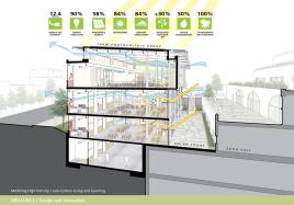 AE interest: Focused on ‘environmental, financial and social sustainability’, photovoltaics and solar hot water panels on roof [a], replaced existing parking lot and dedicated all horizontal exterior surfaces to ‘people, plants, water absorption or renewable power generation’ [a], green roof provides roof insulation and facilitates storm water management (in addition to a detention tank) and filtration [a], 68% of habitable area use natural ventilation (taken from roof due to pollution at lower levels) [a], 96% of habitable spaces day-lit [a], MFE 2014 Grand Winner: Affordable [c], 187 GreenPoint Rating (LEED equivalent: high Gold to low Platinum) [b].