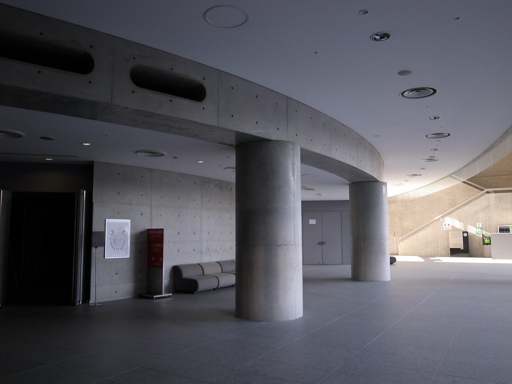AE Interests: The museum is set perpendicular to the coastline which allows for the thin side of the structure to be a giant window overlooking the sea. There is a bracken basket weave pattern over the main entrance glass that is so tight that wind cannot easily go through. Rough polished concrete that reflects exterior light from the window at the end of the building.