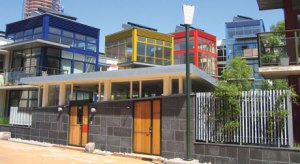 AE Interests: relatively massive two-story building against the road to provide a sound and pollution barrier, The objective was to form a veranda along the whole of this wall (and projecting beyond its ends). Only 3.5m wide, the veranda does not seem at pinched, for its inner wall is glass, and the outer one is an open rectangular lattice screen.