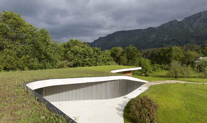 AE Interest: Designed to look similar to surrounding hills, roof garden acting as a natural extension of the ground, concrete slab curved in the shape of a helix supports the roof garden