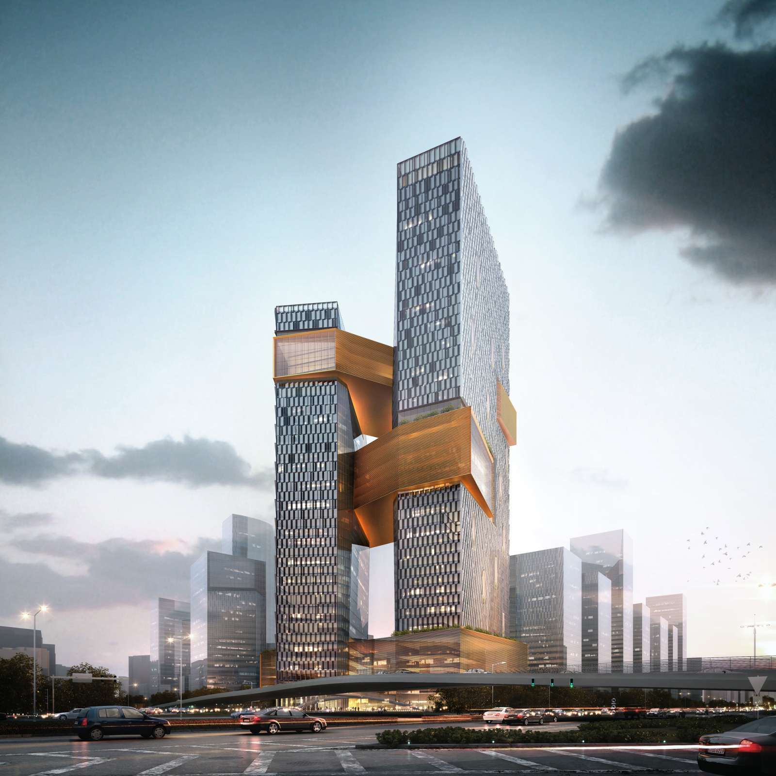 AE Interests: curtain wall incorporates modular shading, reduce carbon emissions by 40% over typical office tower, rotation between towers to capture winds, incorporates three sky bridges.